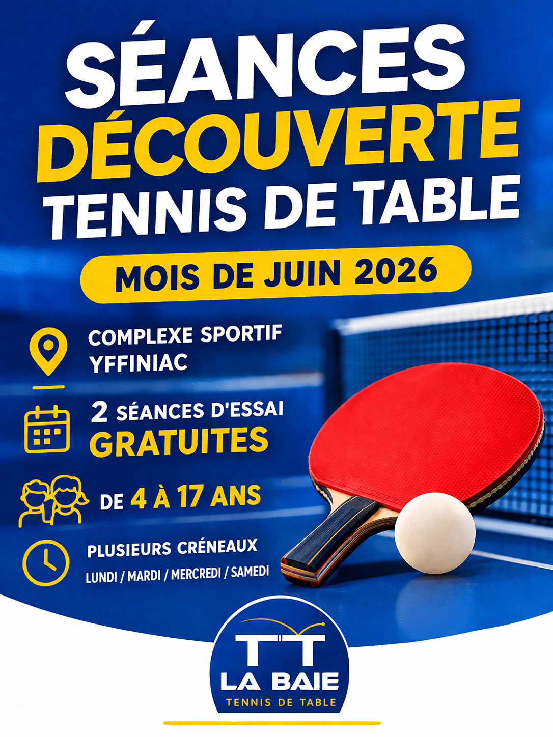Dans le cadre du développement des activités sportives sur notre territoire, le club de TT La Baie – Tennis de Table organise des séances découverte gratuites tout au long du mois de juin 2026 au complexe sportif d’Yffiniac.